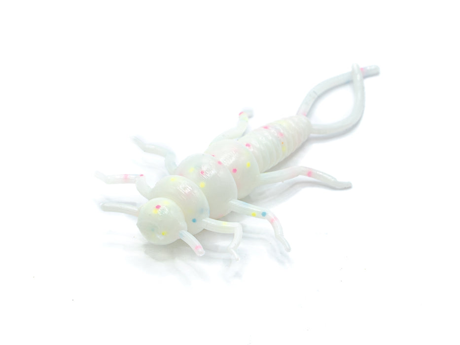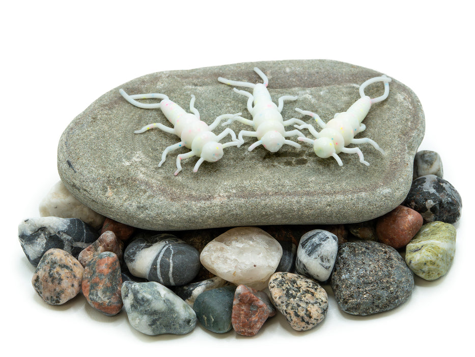 A white Glow Wonderbread stonefly nymph that is great for inland streams and creeks, or when the fish are on the bug bite. The Sinister Stone has your back for when the bite gets tough. Can be fished on a small jighead or a bare hook.